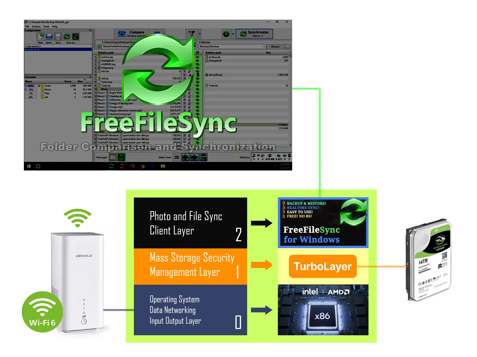 • Integrated Free File Sync: The TurboLayer OS provides the ideal platform to run powerful, open-source file synchronization tools on the top layer. This enables automated, bi-directional sync between your TurboLayer NAS, client devices, and even other cloud storage services.