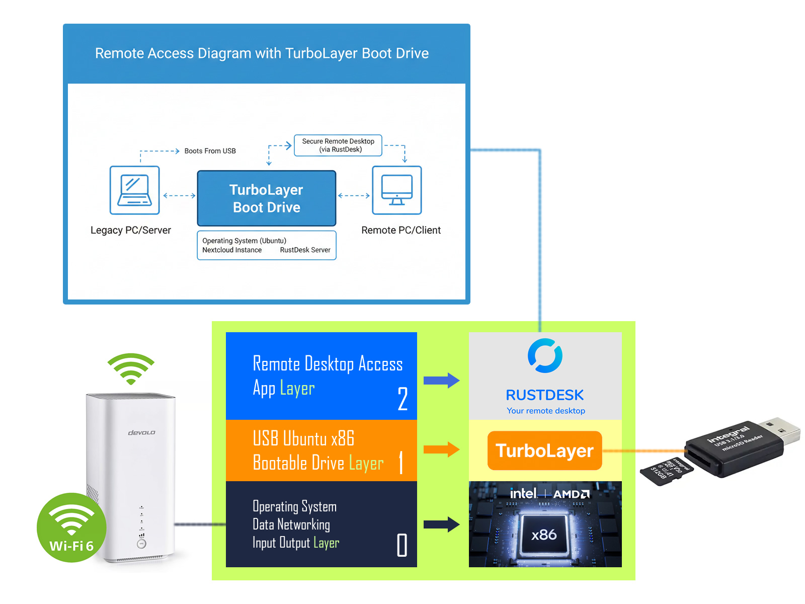 The TurboLayer Boot Drive solves this by pre-configuring the platform for RustDesk—a powerful, open-source remote desktop alternative. By hosting your own RustDesk server on your legacy PC, you gain: